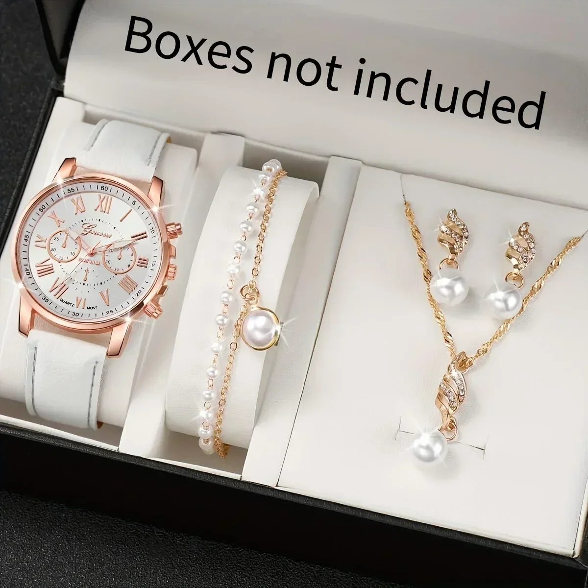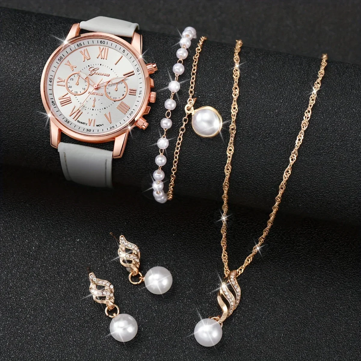 5pcs/set Women's Casual Quartz Watch Set with PU Leather Wrist Watch & Faux Pearl Jewelry, Perfect Gift for Mom