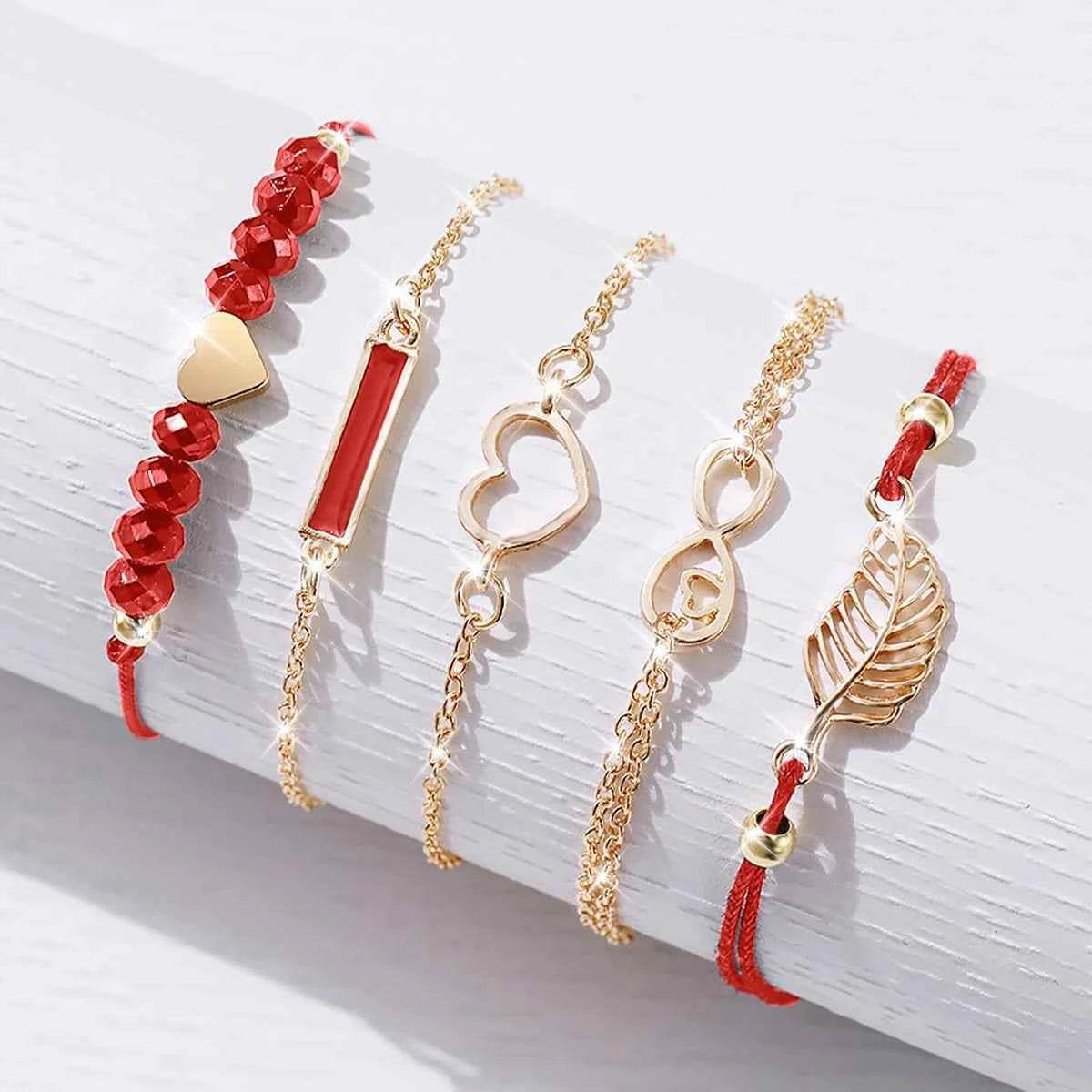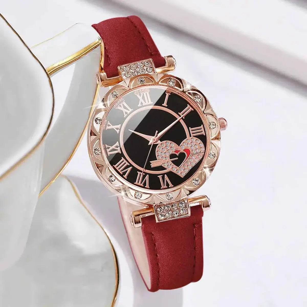 6PCS Women's Fashion Watch Set – Roma Heart Dial Leather Band Quartz Watches with Leaf Bracelets