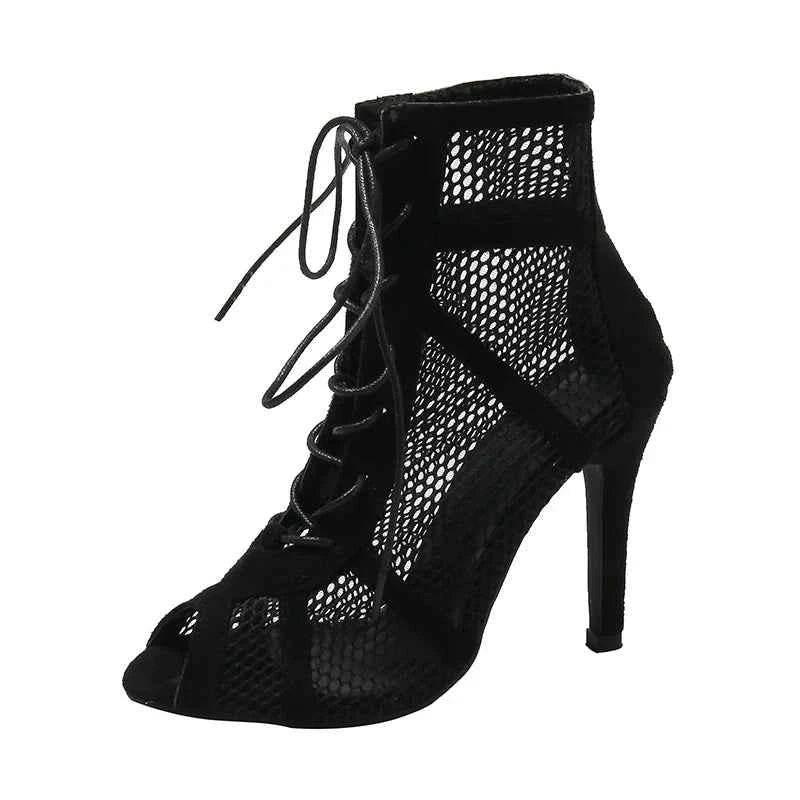 Sexy High Heels Hollow Mesh Sandals Women Summer Cross-tied Peep Toe Heeled Sandals Ankle Strap Dance Shoes Black Net Sandals